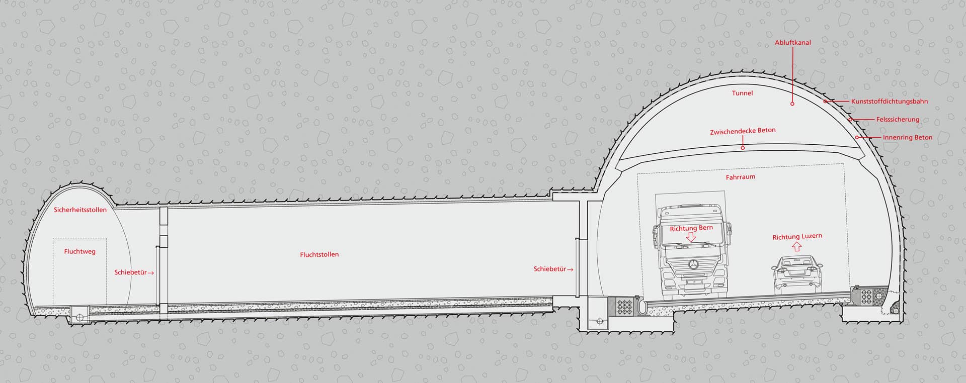 Der parallel zum Haupttunnel verlaufende Sicherheitsstollen ermöglicht im Brandfall die sichere Flucht aus dem Tunnel. Fluchtstollen im Abstand von 200 Metern gewährleisten das Verlassen des Tunnels. Der Sicherheitsstollen steht permanent unter Überdruck, welcher ein Eindringen von Rauch verhindert. Im Ereignisfall zeigen Brandnotleuchten und die grüne Signalisation den Fluchtweg an. Sensoren detektieren den Brandort und schalten leistungsstarke Ventilatoren auf Volllast, um die Brandgase durch den Abluftkanal ins Freie zu leiten. Die hochkomplexe Betriebs- und Sicherheitsausrüstung im Tunnel sorgt unterbruchsfrei für frische Luft und einen sicheren Betrieb im Tunnel. Sie stellt die Alarmierung bei Ereignissen automatisch sicher.